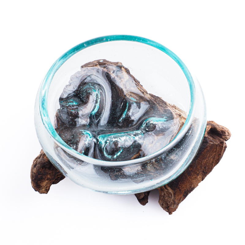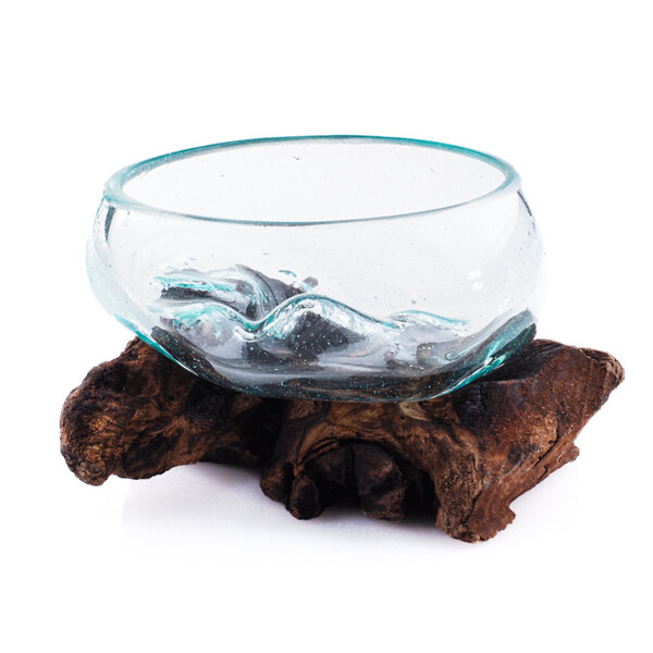 An extraordinary fusion of nature and human creativity in the form of a small glass bowl set in an unfinished piece of wood, that comes from the exotic island of Bali, where it is handcrafted by local artists.