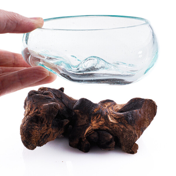 Each piece is a true original and genuine work of art. The molten glass is shaped directly onto a specific piece of wood, allowing it to conform perfectly to the unique curves of the root. The small bowl is removable for easy cleaning yet remains securely stable.