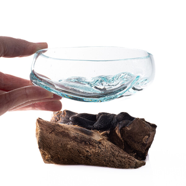 An extraordinary fusion of nature and human creativity in the form of a small glass bowl set in an unfinished piece of wood, that comes from the exotic island of Bali, where it is handcrafted by local artists.