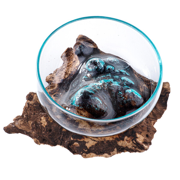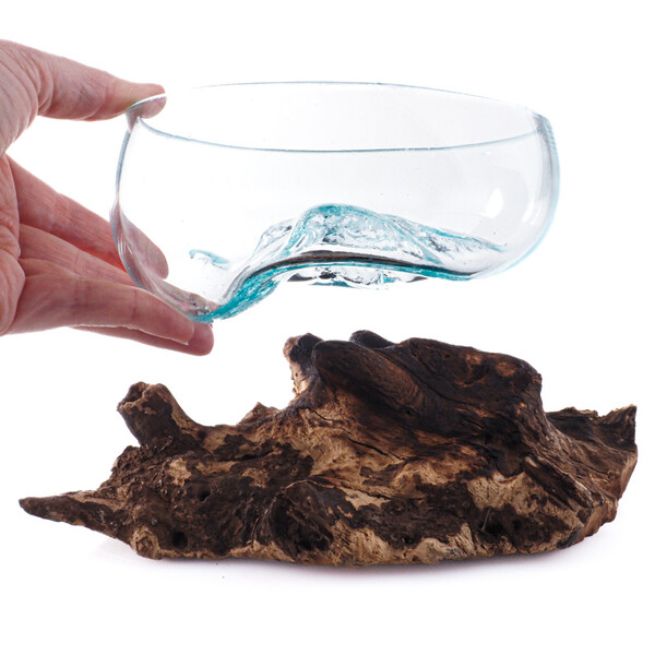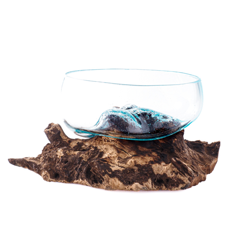 An extraordinary fusion of nature and human creativity in the form of a glass bowl set in an unfinished piece of wood, that comes from the exotic island of Bali, where it is handcrafted by local artists.