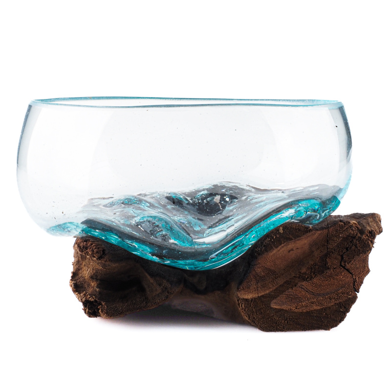 An extraordinary fusion of nature and human creativity in the form of a glass bowl set in an unfinished piece of wood, that comes from the exotic island of Bali, where it is handcrafted by local artists.