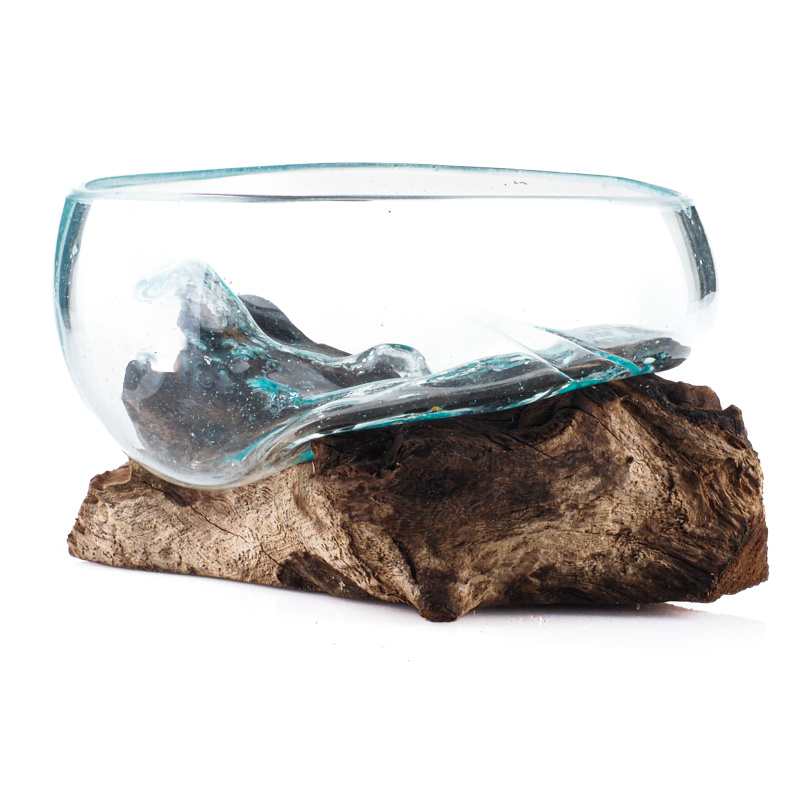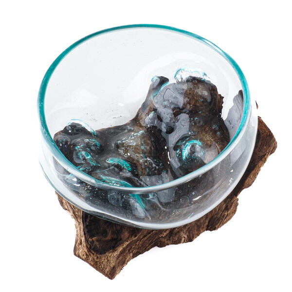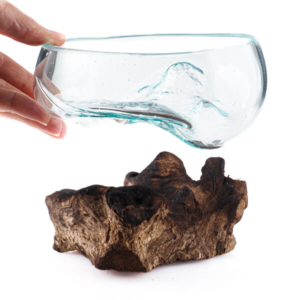 An extraordinary fusion of nature and human creativity in the form of a glass bowl set in an unfinished piece of wood, that comes from the exotic island of Bali, where it is handcrafted by local artists.