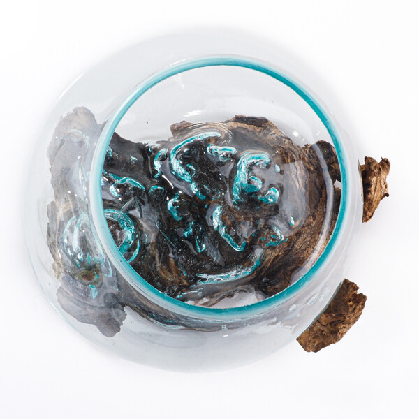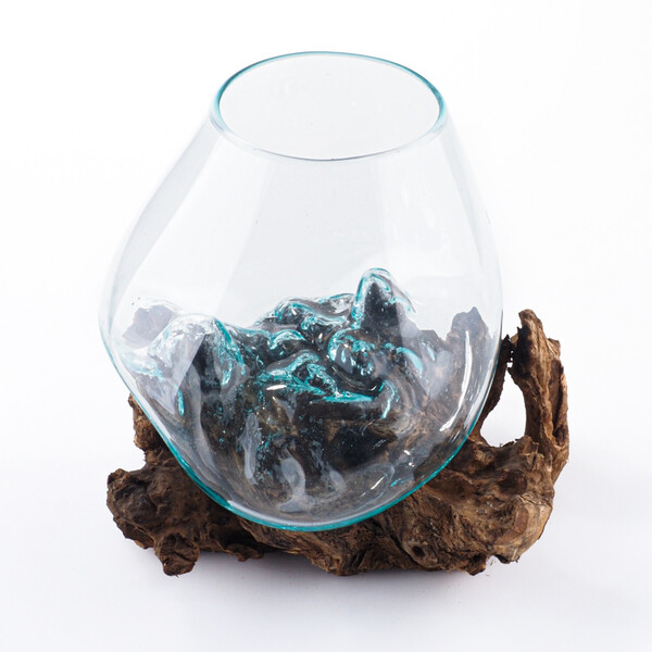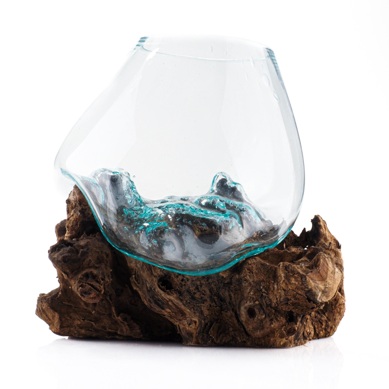 Each piece is a true original and genuine work of art. The molten glass is shaped directly onto a specific piece of wood, allowing it to conform perfectly to the unique curves of the root. The jar is removable for easy cleaning yet remains securely stable.