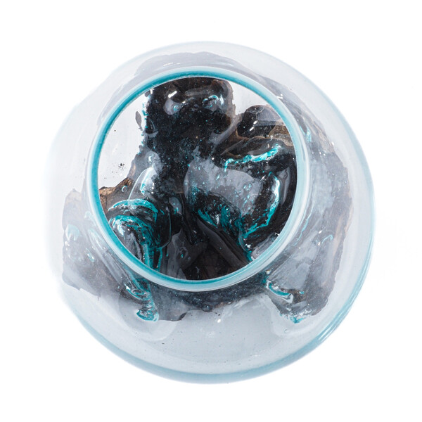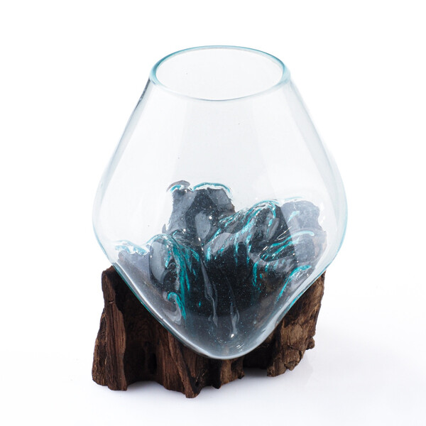 Each piece is a true original and genuine work of art. The molten glass is shaped directly onto a specific piece of wood, allowing it to conform perfectly to the unique curves of the root. The jar is removable for easy cleaning yet remains securely stable.