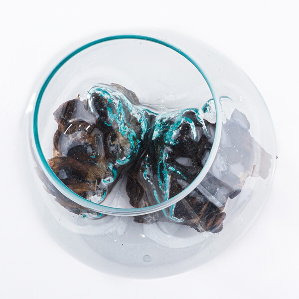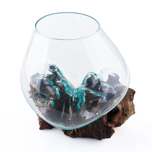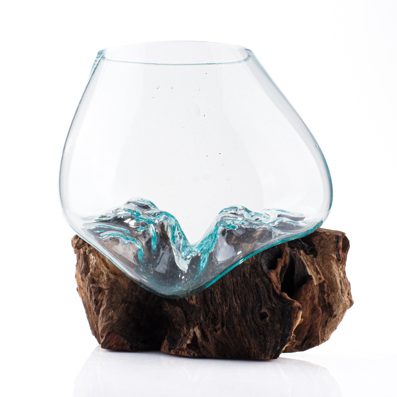 Each piece is a true original and genuine work of art. The molten glass is shaped directly onto a specific piece of wood, allowing it to conform perfectly to the unique curves of the root. The jar is removable for easy cleaning yet remains securely stable.