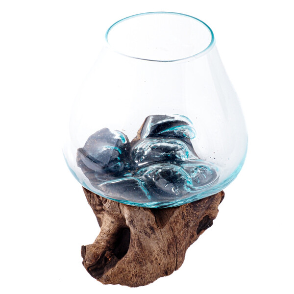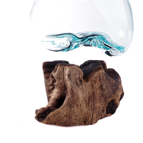 Each piece is a true original and genuine work of art. The molten glass is shaped directly onto a specific piece of wood, allowing it to conform perfectly to the unique curves of the root. The jar is removable for easy cleaning yet remains securely stable.