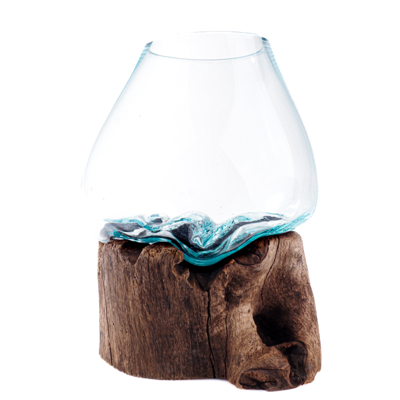 An extraordinary fusion of nature and human creativity in the form of a glass jar set in an unfinished piece of wood, that comes from the exotic island of Bali, where it is handcrafted by local artists.