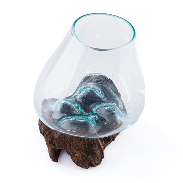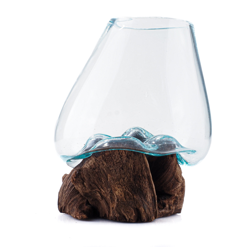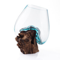 Each piece is a true original and genuine work of art. The molten glass is shaped directly onto a specific piece of wood, allowing it to conform perfectly to the unique curves of the root. The jar is removable for easy cleaning yet remains securely stable.