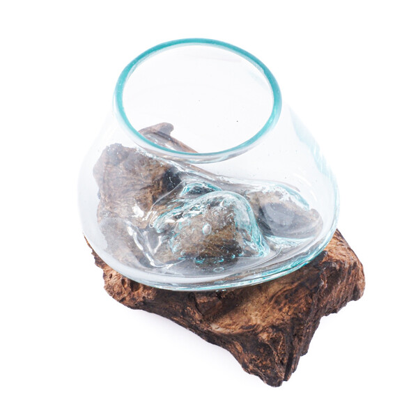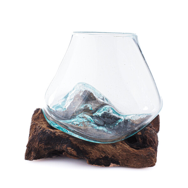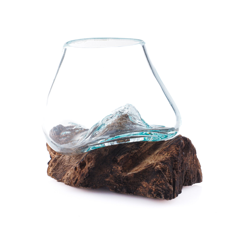 Each piece is a true original and genuine work of art. The molten glass is shaped directly onto a specific piece of wood, allowing it to conform perfectly to the unique curves of the root. The jar is removable for easy cleaning yet remains securely stable.