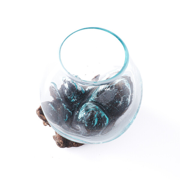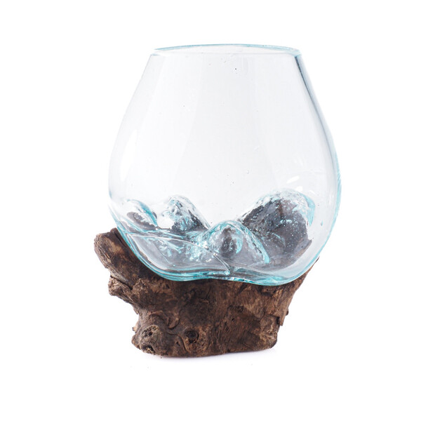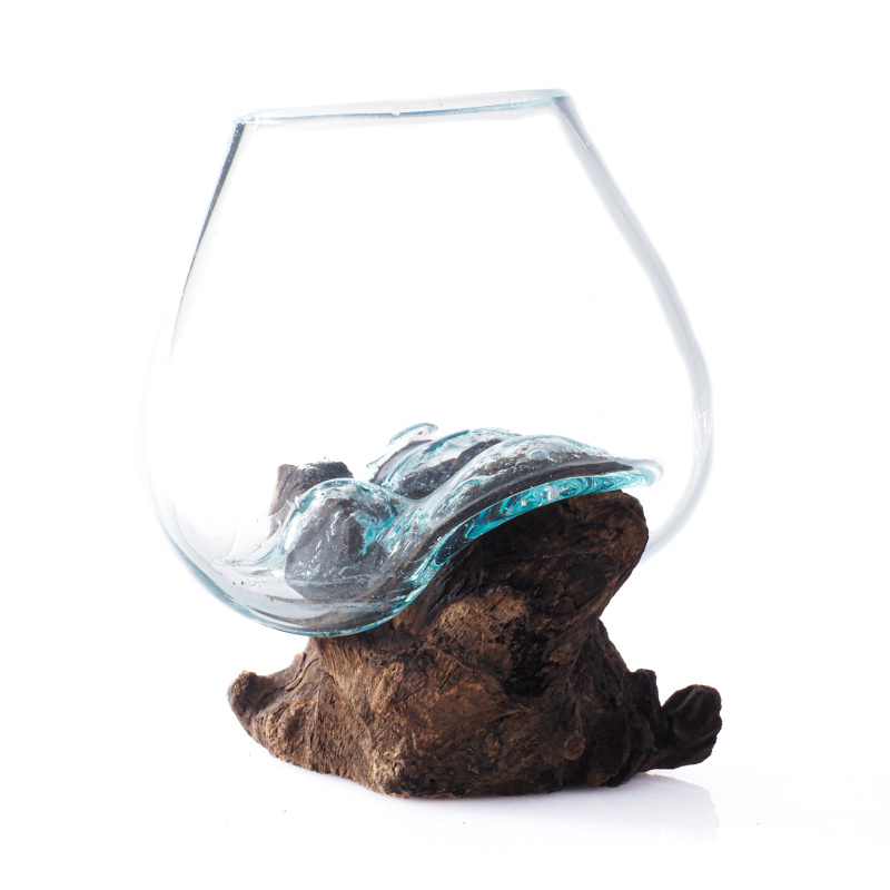 Each piece is a true original and genuine work of art. The molten glass is shaped directly onto a specific piece of wood, allowing it to conform perfectly to the unique curves of the root. The jar is removable for easy cleaning yet remains securely stable.