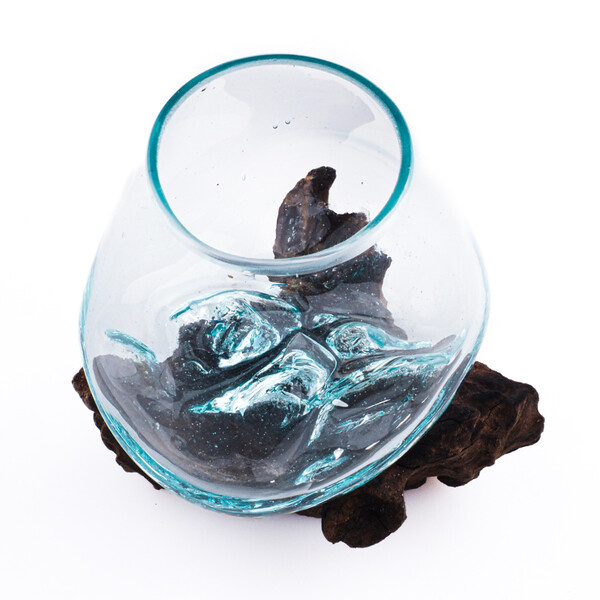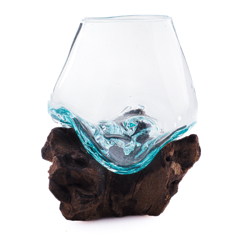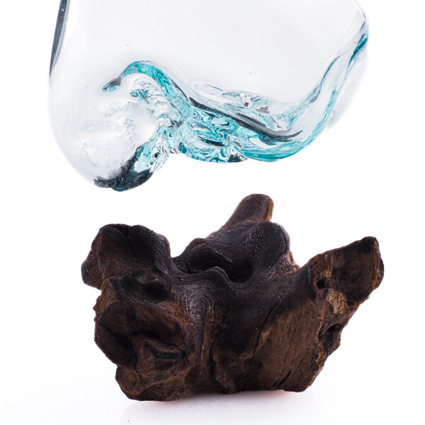 Each piece is a true original and genuine work of art. The molten glass is shaped directly onto a specific piece of wood, allowing it to conform perfectly to the unique curves of the root. The jar is removable for easy cleaning yet remains securely stable.