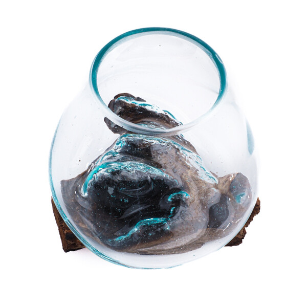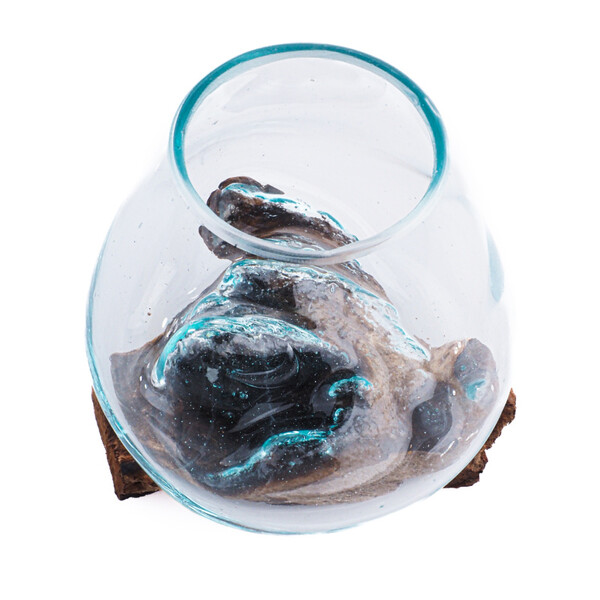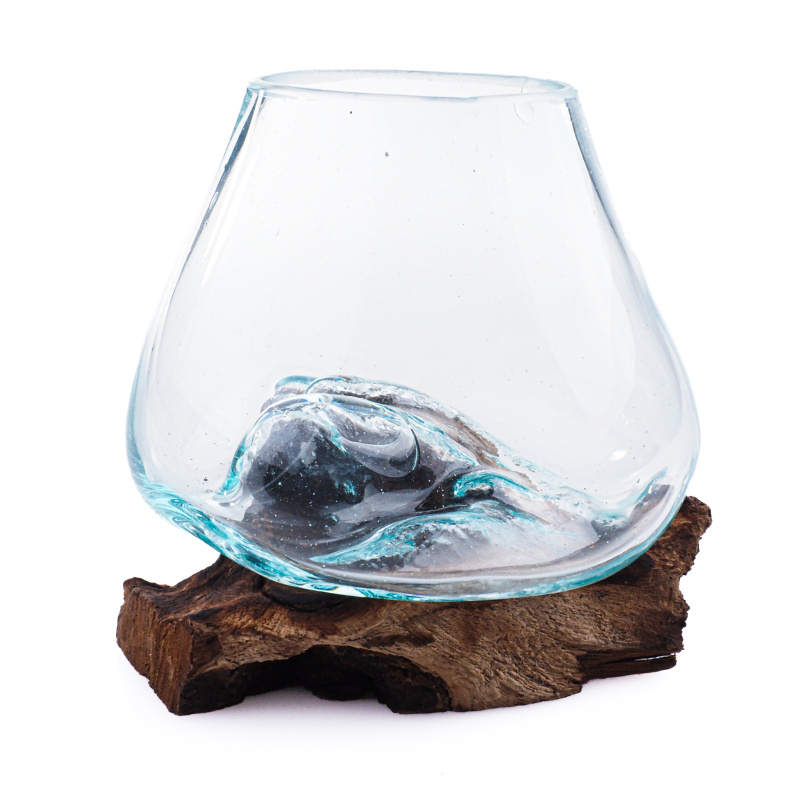 Each piece is a true original and genuine work of art. The molten glass is shaped directly onto a specific piece of wood, allowing it to conform perfectly to the unique curves of the root. The jar is removable for easy cleaning yet remains securely stable.