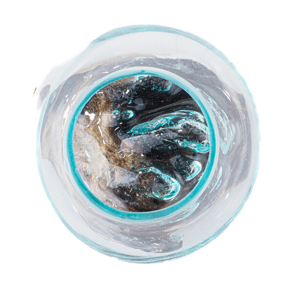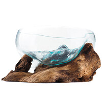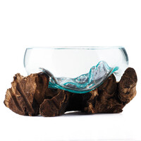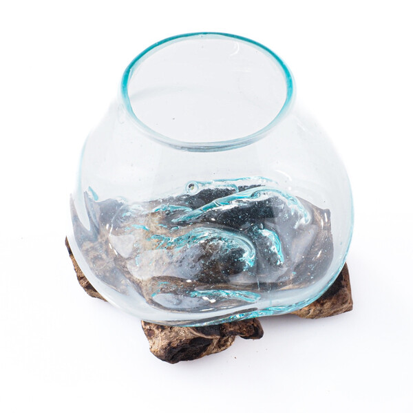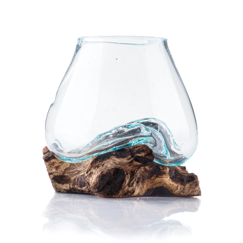 Each piece is a true original and genuine work of art. The molten glass is shaped directly onto a specific piece of wood, allowing it to conform perfectly to the unique curves of the root. The jar is removable for easy cleaning yet remains securely stable.