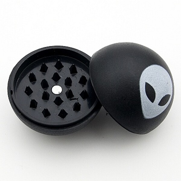 Plastic ball-shaped shredder with very sharp tips and magnetic lock. The crusher is decorated with Alien motif.