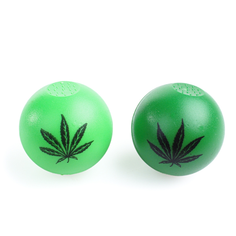 Plastic ball-shaped shredder with very sharp tips and magnetic lock. The crusher is decorated with a hemp leaf motif.