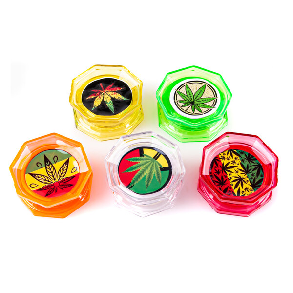 Plastic shredder with very sharp tips decorated with hemp leaf motif. There are several colour variants of these shredders in our offer