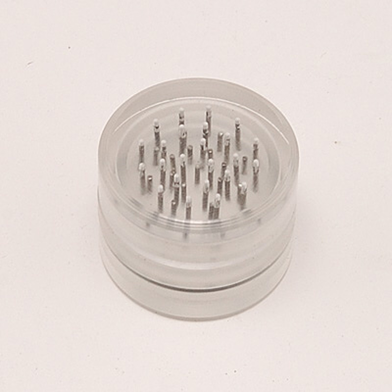 Transparent plastic shredder with inserted metal tines and herb storage tray.