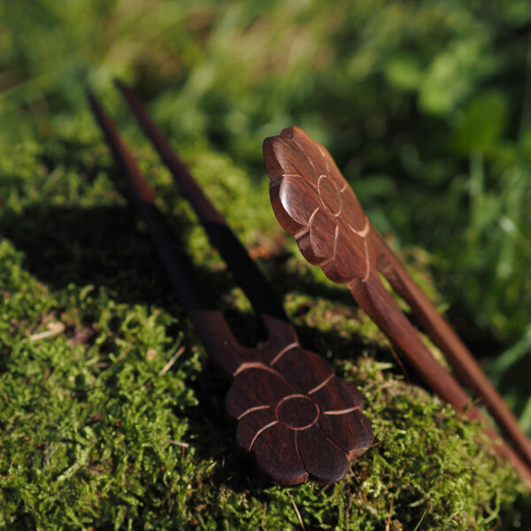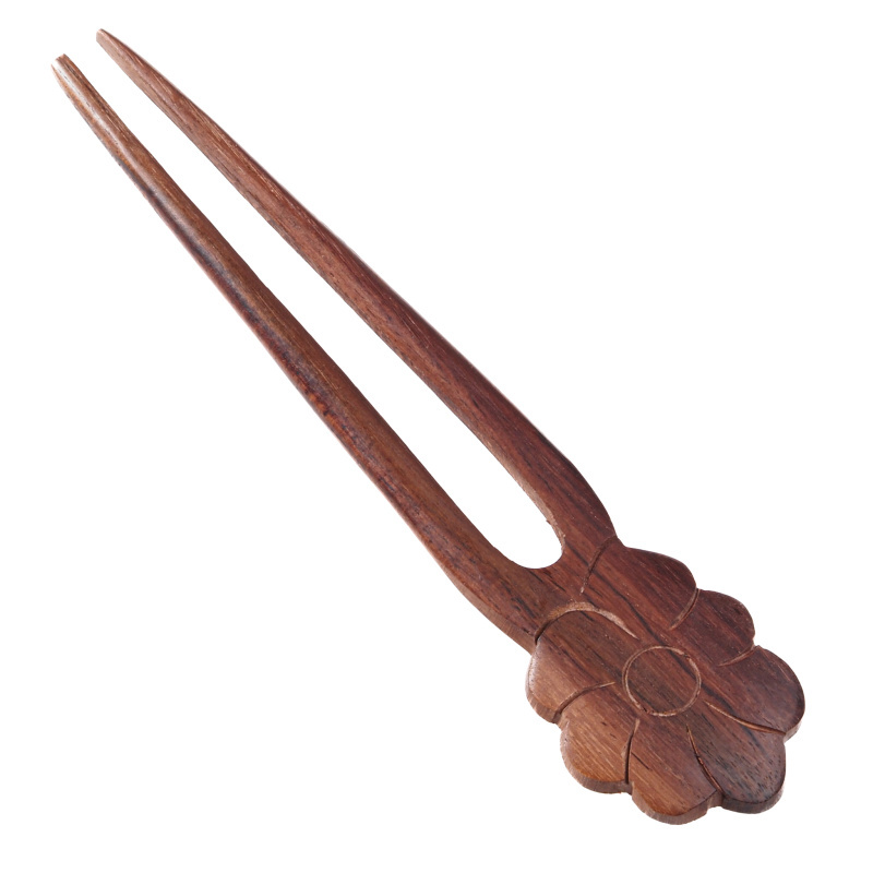 There is beauty in simplicity, and a natural wooden hairpin will make a charming addition to your hairstyle. Its widened flower-shaped end with notches is designed to secure hair in place.