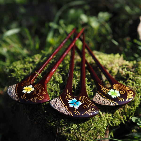 The high-quality processed wood will please every natural materials lover. Wooden hair accessories do not disrupt hair structure, have antistatic properties, and prevent breakage and damage. However, it is not recommended to expose them to moisture or use them on wet hair. It is recommended to occasionally treat the hairpin with a standard hand cream or a drop of olive oil to maintain its condition and restore its shine.