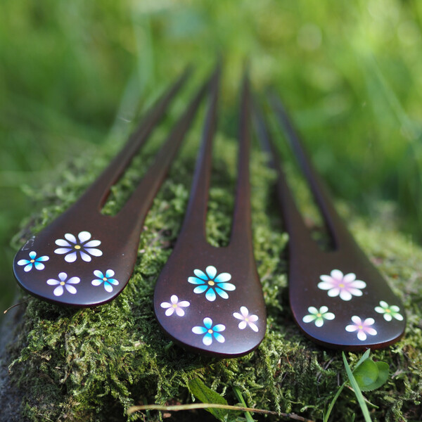 The high-quality processed wood will please every natural materials lover. Wooden hair accessories do not disrupt hair structure, have antistatic properties, and prevent breakage and damage. However, it is not recommended to expose them to moisture or use them on wet hair. It is recommended to occasionally treat the hairpin with a standard hand cream or a drop of olive oil to maintain its condition and restore its shine.