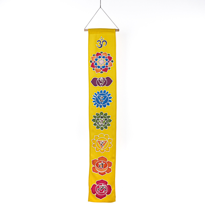 Decorative curtain with the motif of all chakras and the symbol of Om on the top, originating from the Indonesian island of Bali, shines with bright colours and brings a strong whiff of positive energy into any interior. It brings harmony and balance by representing the connection between the chakras – from the root to the crown.