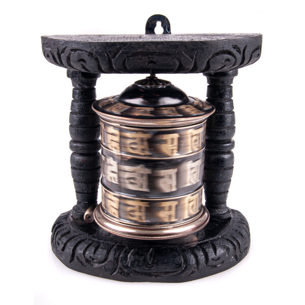 The Tibetan prayer mill (Mani Khorlo) is basically a cylinder of metal, wood, stone or other material, decorated on the outside with mantras, sutras or auspicious symbols. It is mounted on a wooden spike, around which is wrapped paper described not with prayers but with mantras, most commonly the mantra Om mani padme hum. By turning the grinder clockwise, the mantra inside the grinder unfolds as if it were being read, releasing good karma into the surroundings. Each turn of the grinder is as meritorious as reading the mantra aloud as many times as it is written on the paper inside the grinder. This means that the more mantras written on the paper, the more powerful the mantra becomes by turning the mill. The correct procedure is a slow smooth turning of the wheel with motivation, compassion, and the wish for full enlightenment in mind for the benefit of all living beings.