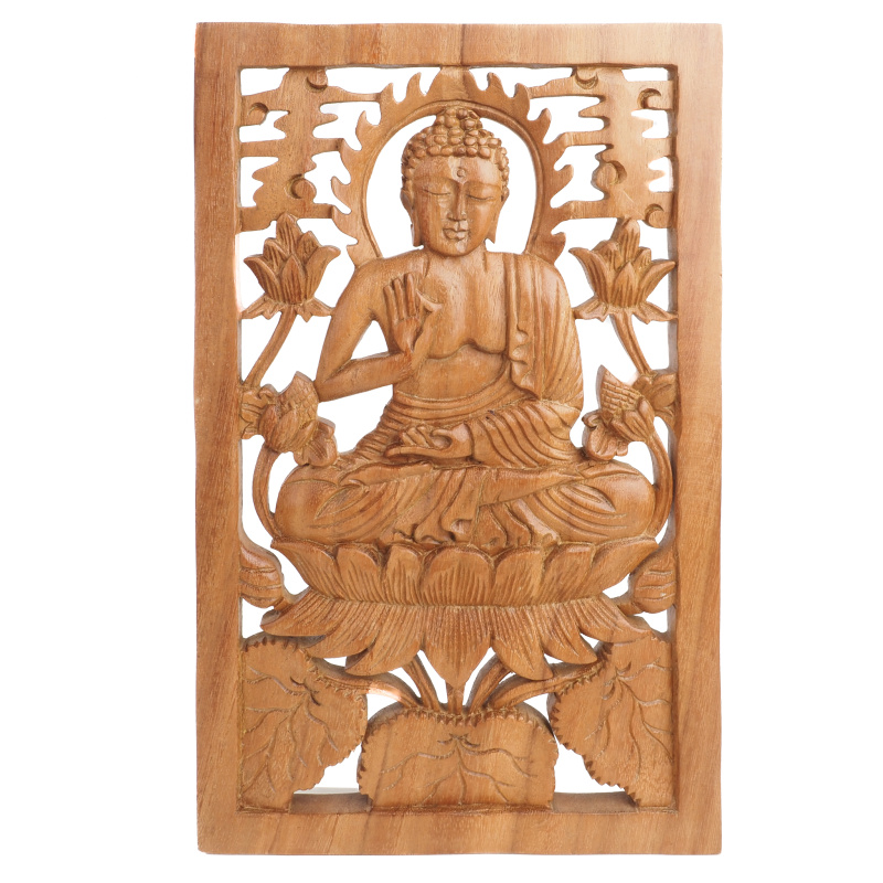 The intricately carved painting depicts a seated Buddha with the Vitarka mudra gesture.