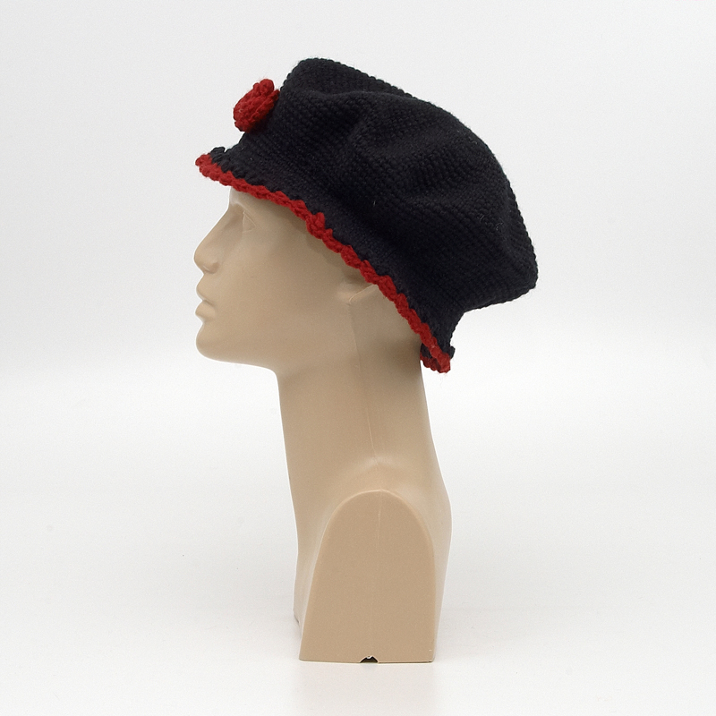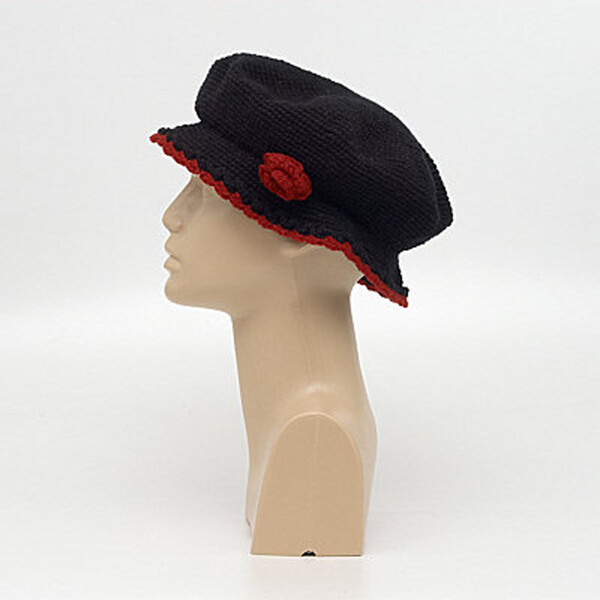 Woolen hat with knitted flower and coloured brim, colour black and burgundy
