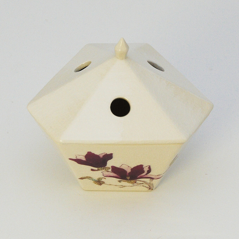 Ceramic incense cone holder, adorned with floral motif and imitation of antique patina with crackled lacquer. The holder resembles a small house with a roof featuring three openings, from which smoke charmingly rises when the cone is lit.