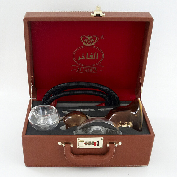 Small hookah of a recognized brand. Al Fakher has been producing premium Arabic tobaccos since 1999, but has now launched small hookah in seven colour variants, packaged in padded cases. As well as the hookah itself, the colourful luggage includes a plastic hose, glass bowl, glass tray and glass charcoal strainer.