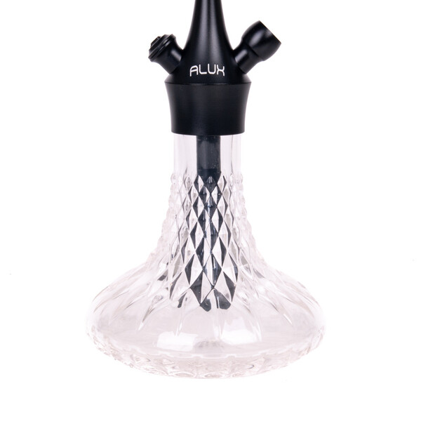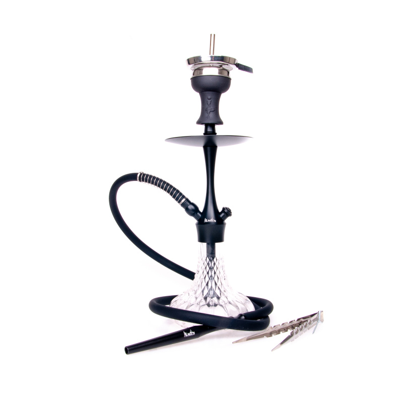 The Aladin Alux 380 is a single-handle hookah, which includes a silicone hose with mouthpiece, a ceramic bowl with badcha and tongs. The body and the base are connected by the Click bayonet system, which makes the hookah easier to assemble and disassemble. The downstem (downpipe) is fitted with an adjustable diffuser, allowing you to quiet the gurgle and soften the draw.