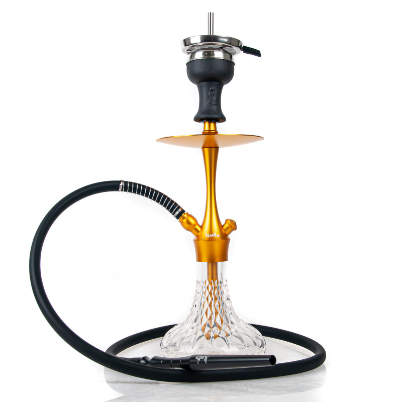 The Aladin Alux 380 is a single-handle hookah, which includes a silicone hose with mouthpiece, a ceramic bowl with badcha and a tongs. The body and the base are connected by the Click bayonet system, which makes the hookah easier to assemble and disassemble. The downstem (downpipe) is fitted with an adjustable diffuser, allowing you to quiet the gurgle and soften the draw.
