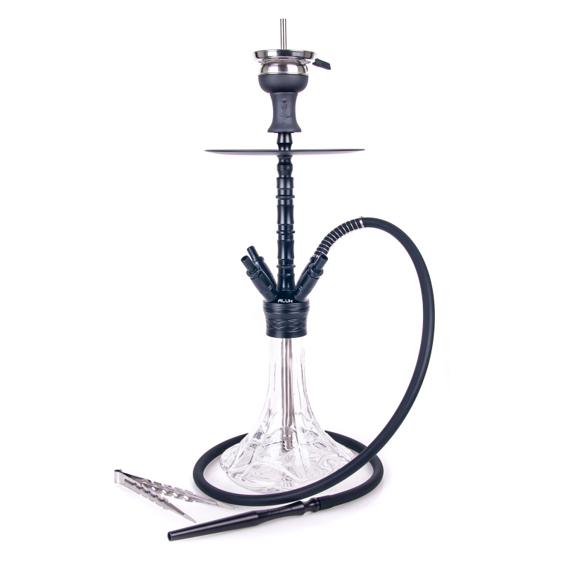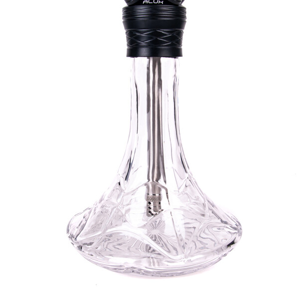 The Aladin Alux M7 is a four-handle hookah that includes, in addition to a single silicone hose with a mouthpiece, a ceramic bowl with a badcha and tongs. The body and base are connected by an internal Click bayonet system, which makes the hookah easier to assemble and disassemble. The glass of the hookah base is not only beautifully decorated but also solid, giving the hookah a stability you can rely on. The downstem (bottom tube) is fitted with an adjustable diffuser, allowing you to quiet the gurgle and soften the draw.