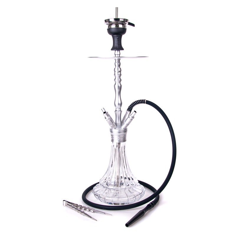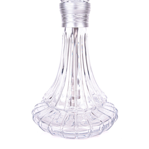 The Aladin Alux M8 is a four-handle hookah that includes, in addition to a single silicone hose with mouthpiece, a ceramic bowl with badcha and tongs. The body and base are connected by an internal Click bayonet system, which makes the hookah easier to assemble and disassemble. The glass of the hookah base is not only beautifully decorated but also solid, giving the hookah a stability you can rely on. The downstem (bottom tube) is fitted with an adjustable diffuser, allowing you to quiet the gurgle and soften the draw.