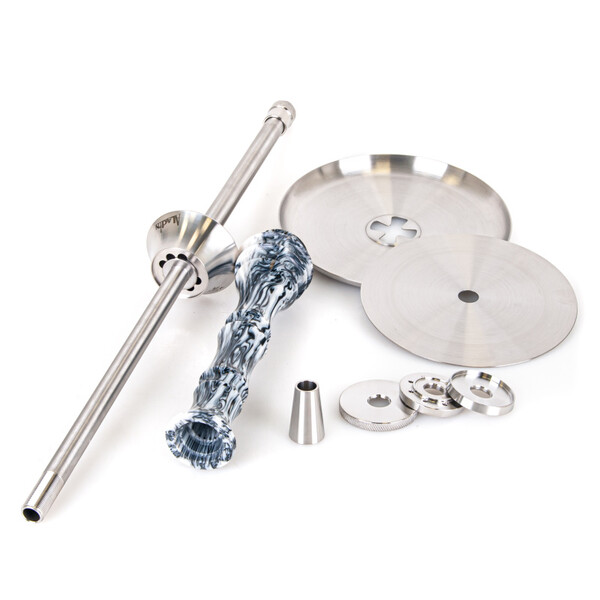 The Aladin Epox Nylon 540 body is made of high-quality polished stainless steel and decorated with a stylish epoxy sleeve. The body is connected to the base by a well-fitting seal. The hookah uses a "cut" connector to connect the hose, which eliminates the need to use a silicone gasket for connecting. A removable, adjustable diffuser allows the user to adjust the hookahs's draw as desired.