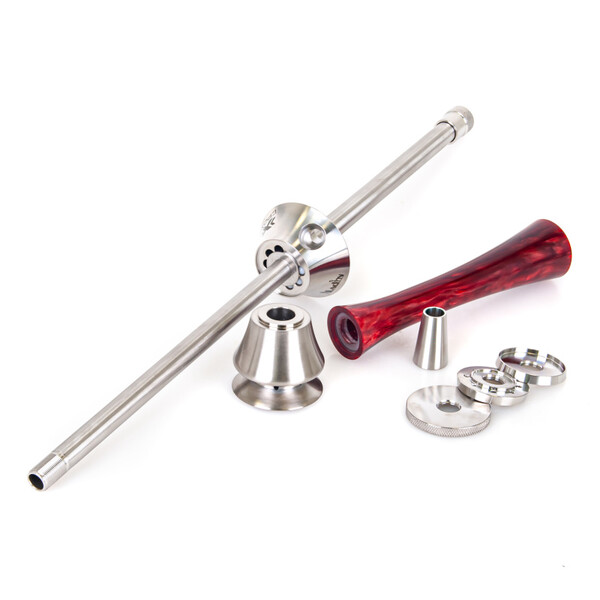 The Aladin Epox Nylon 580 body is made of high-quality polished stainless steel and decorated with a stylish epoxy sleeve. The body is connected to the base by a well-fitting seal. The hookah uses a "cut" connector to connect the hose, which eliminates the need to use a silicone gasket for connecting. A removable, adjustable diffuser allows the user to adjust the hookah's draw as desired.