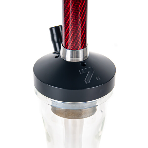 The Izzy Carbon hookah is basically just a stainless steel pipe with a heart made of high quality and very durable plastic, decorated with a carbon sleeve. There is also an easily removable diffuser at the end of the steel downstem. The hose is connected with an end piece fitted with several rubber o-rings for a secure fit in the heart of the hookah.