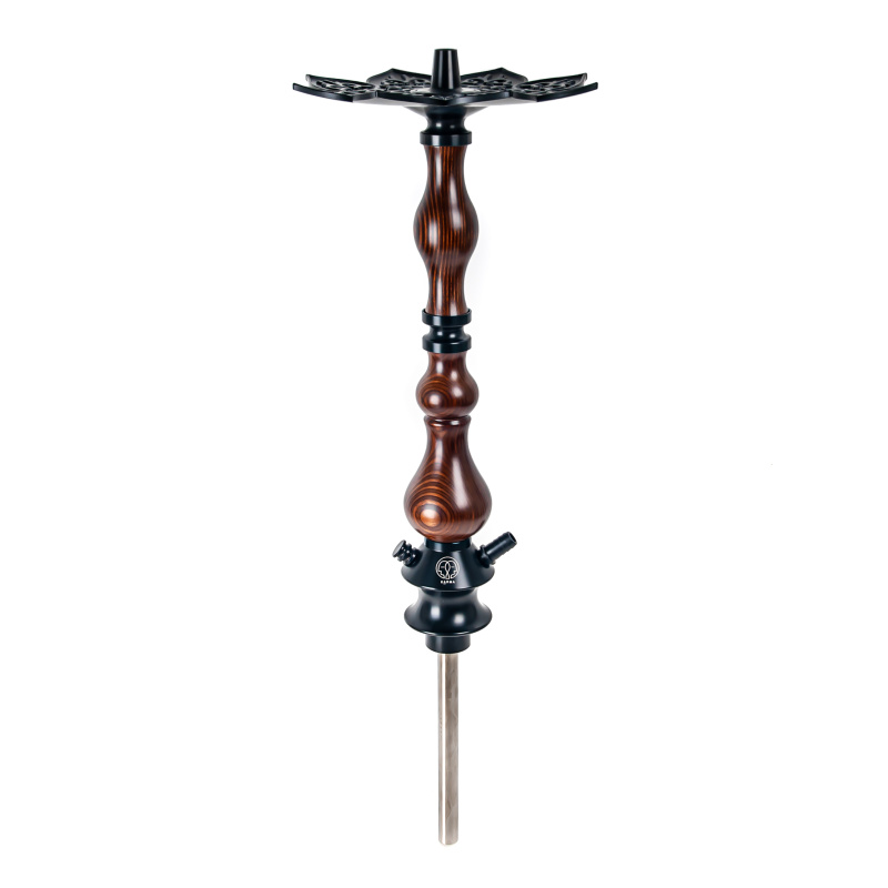 The Karma hookah consists of parts made of different materials. The heart is made of durable polyacetal, the top of the stem and the tray are made of anodized aluminum, the manufacturers used stainless steel for the downstem and the stem got a wooden cover. The hookah can be completely disassembled and each component properly cleaned. The hookah has a very pleasant and light draw.