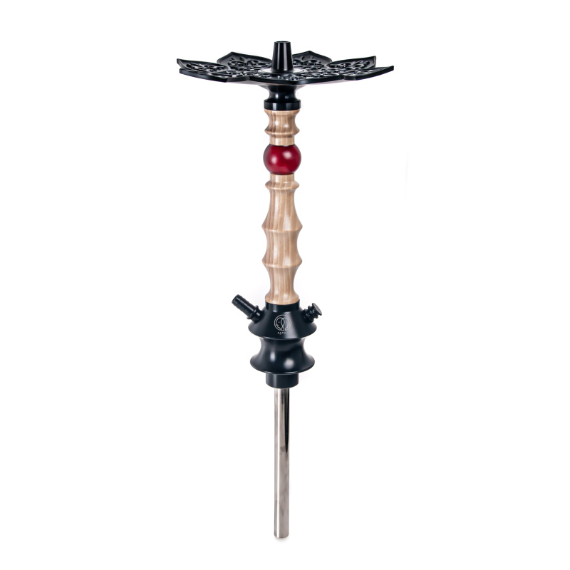 The Karma hookah consists of parts made of different materials. The heart is made of durable polyacetal, the top of the stem and the tray are made of anodized aluminum, the manufacturers used stainless steel for the downstem and the stem got a wooden cover. The hookah can be completely disassembled and each component properly cleaned. The hookah has a very pleasant and light draw.