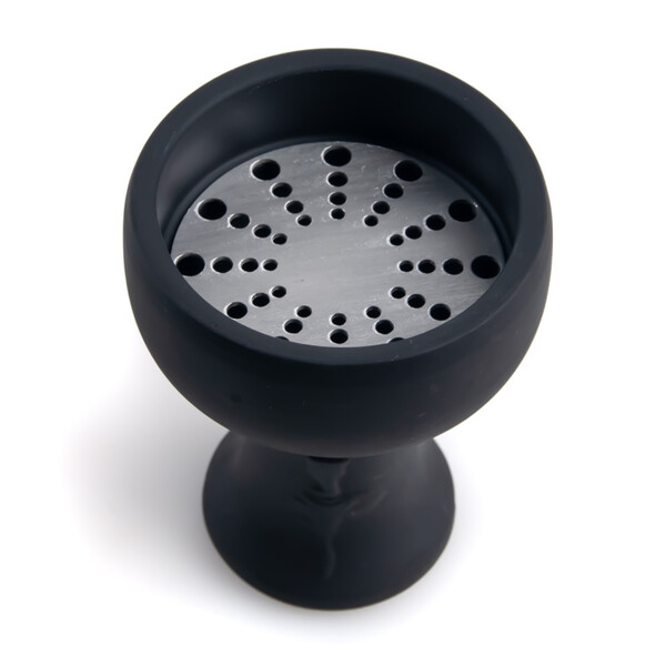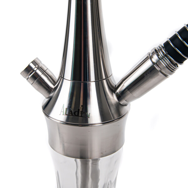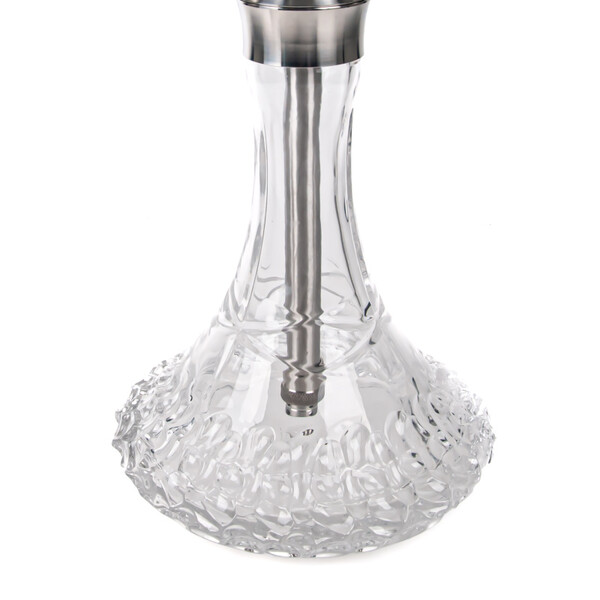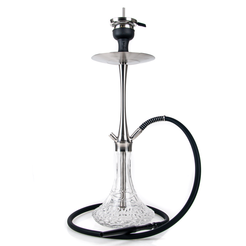 The MVP A 55 Clear Cuts Hookah is milled from a substantial piece of stainless steel, which helps for better stability. The hookah will not tip over easily, even with careless handling. The decorated base gives the hookah a subtle touch of elegance and luxury. The downstem (bottom tube) is fitted with an adjustable diffuser, which softens the draw and reduces the gurgling. The hookah is complemented by a silicone soft touch hose with a soft velvety surface, which has a very pleasant feel. The black hose is matched by a black aluminium mouthpiece. And on top of the hookah is the ceramic Optimus bowl (without additional rings) with badcha.