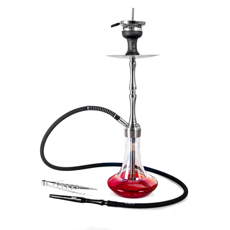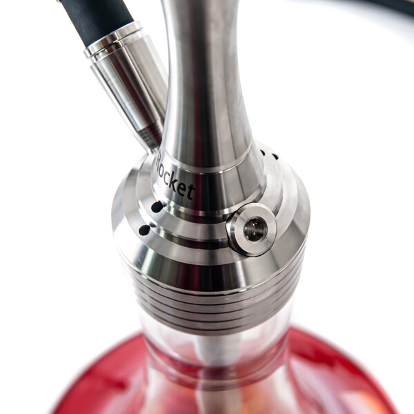 The MVP Rocket Shiny Bottom Red hookah is milled from a hefty piece of stainless steel, which helps for better stability. The hookah won't just topple over even with careless handling. The downstem (bottom tube) is fitted with an adjustable diffuser to soften the draw and reduce the gurgling. The hookah is complemented by a silicone soft touch hose with a soft velvety surface, which has a very pleasant feel. The black hose fits with a black aluminium mouthpiece. And at the top of the hookah is the ceramic Optimus bowl (without additional rings) with badcha.