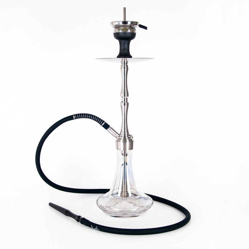 The MVP Rocket Shiny Clear hookah is milled from a hefty piece of stainless steel, which helps for better stability. The hookah won't just topple over even with careless handling. The downstem (bottom tube) is fitted with an adjustable diffuser to soften the draw and reduce the gurgling. The hookah is complemented by a silicone soft touch hose with a soft velvety surface, which has a very pleasant feel. The black hose fits with a black aluminium mouthpiece. And at the top of the hookah is the ceramic Optimus bowl (without additional rings) with badcha.