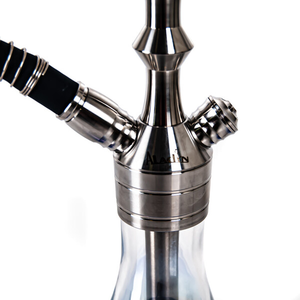 The MVP360 Shiny Bottom Blue hookah is milled from a hefty piece of stainless steel, which aids in better stability. The hookah won't topple over, even with careless handling. The downstem (bottom tube) is fitted with an adjustable diffuser to soften the draw and reduce the gurgling. The hookah is complemented by a silicone soft touch hose with a soft velvety surface, which has a very pleasant feel. The black hose fits with a black aluminium mouthpiece. And on top of the hookah is the ceramic Optimus bowl (without additional rings) with badcha.