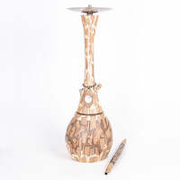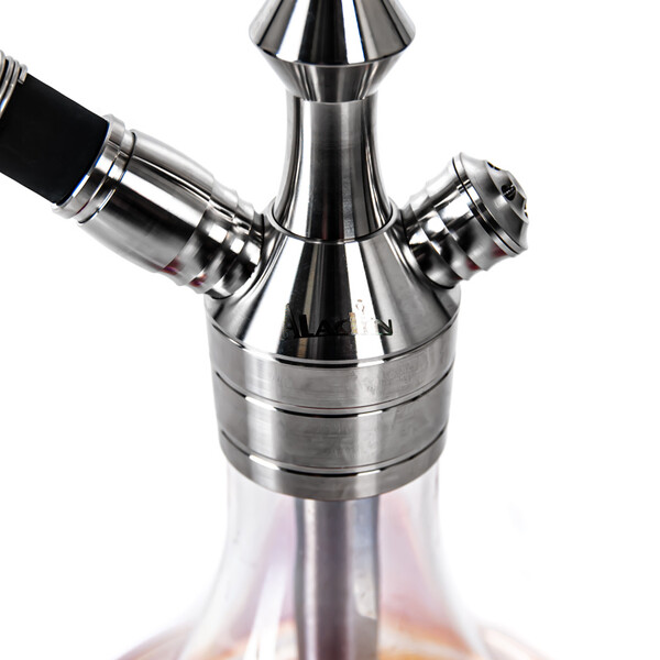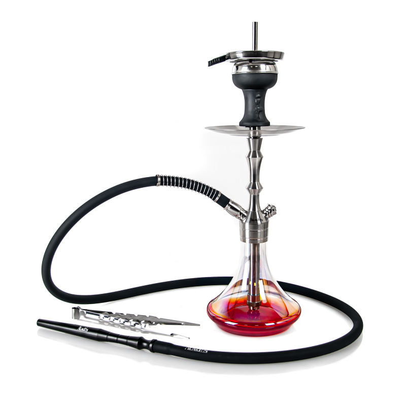 The MVP360 Shiny Bottom Red hookah is milled from a hefty piece of stainless steel, which aids in better stability. The hookah won't topple over, even with careless handling. The downstem (bottom tube) is fitted with an adjustable diffuser to soften the draw and reduce the gurgling. The hookah is complemented by a silicone soft touch hose with a soft velvety surface, which has a very pleasant feel. The black hose fits with a black aluminium mouthpiece. And on top of the hookah is the ceramic Optimus bowl (without additional rings) with badcha.