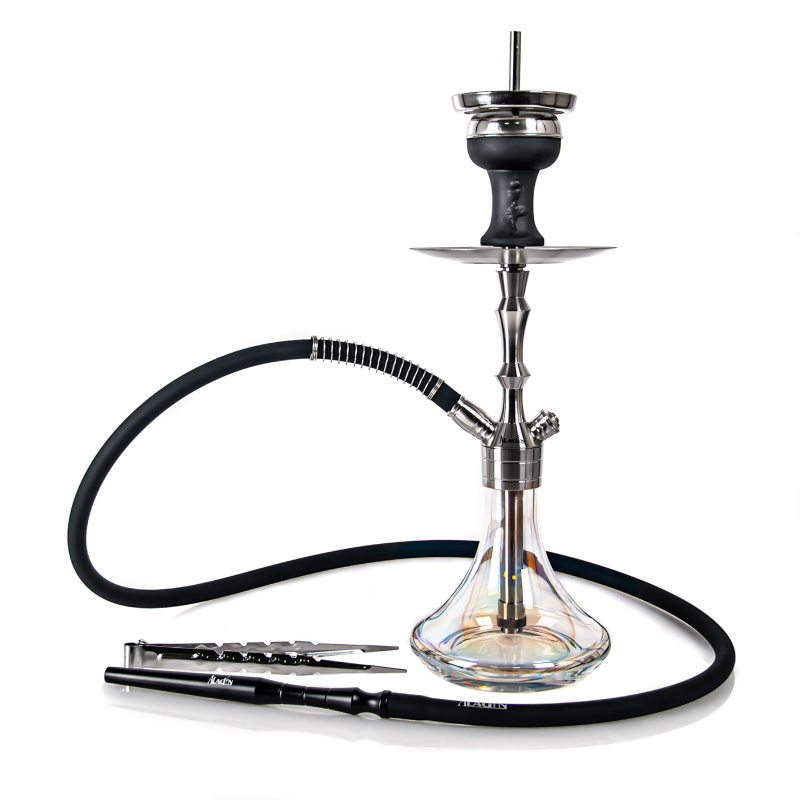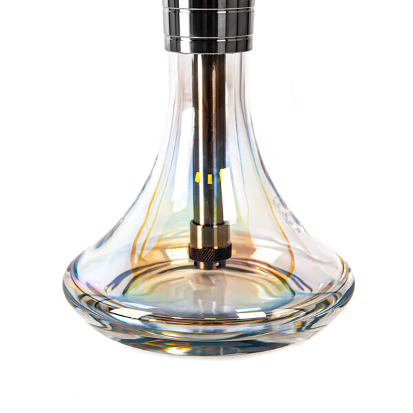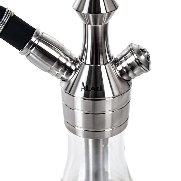 The MVP360 Shiny Clear hookah is milled from a hefty piece of stainless steel, which aids in better stability. The hookah won't topple over, even with careless handling. The downstem (bottom tube) is fitted with an adjustable diffuser to soften the draw and reduce the gurgling. The hookah is complemented by a silicone soft touch hose with a soft velvety surface, which has a very pleasant feel. The black hose fits with a black aluminium mouthpiece. And on top of the hookah is the ceramic Optimus bowl (without additional rings) with badcha.