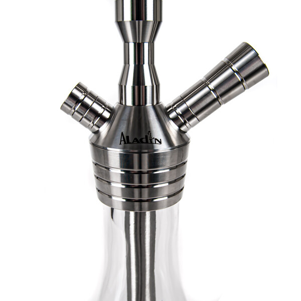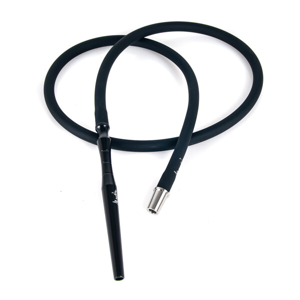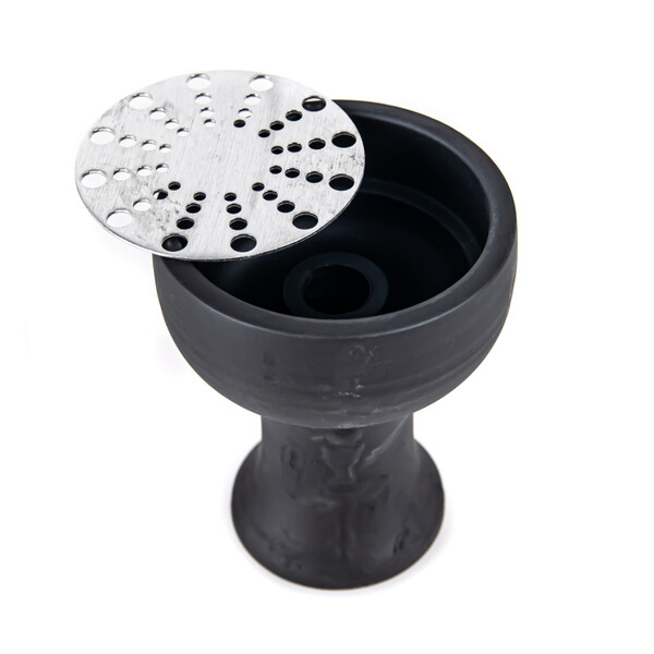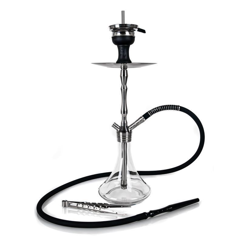 The MVP 460 hookah is milled from a solid piece of stainless steel, which helps for better stability. The hookah won't just topple over even with careless handling. In addition to the glass base, the hookah also comes with a silicone soft touch hose, which has a very pleasant feel. The downstem (bottom tube) is fitted with an adjustable diffuser to soften the draw and reduce the gurgling. The black hose fits with a black aluminium mouthpiece. And on top of the hookah is a deep, classic ceramic bowl.