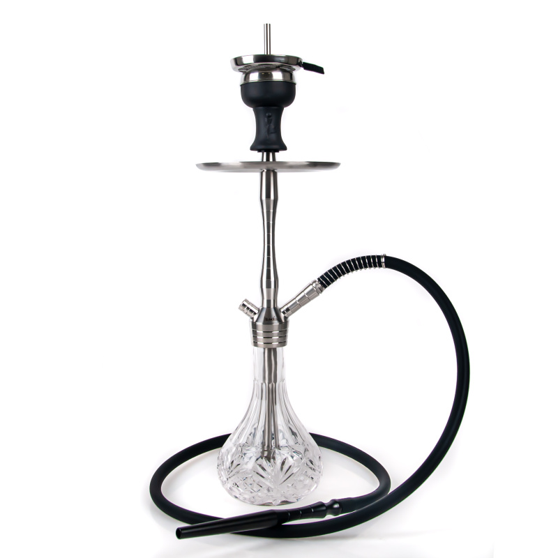 The MVP470 Flower hookah is milled from a hefty piece of stainless steel, which helps for better stability. The hookah won't just topple over, even with careless handling. The decorated base gives the hookah a subtle touch of elegance and luxury. The downstem (bottom tube) is fitted with an adjustable diffuser to soften the draw and reduce the gurgling. The hookah is complemented by a silicone soft touch hose with a soft velvety surface, which has a very pleasant feel. The black hose fits with a black aluminium mouthpiece. And on top of the hookah is the ceramic Optimus bowl (without additional rings) with badcha.