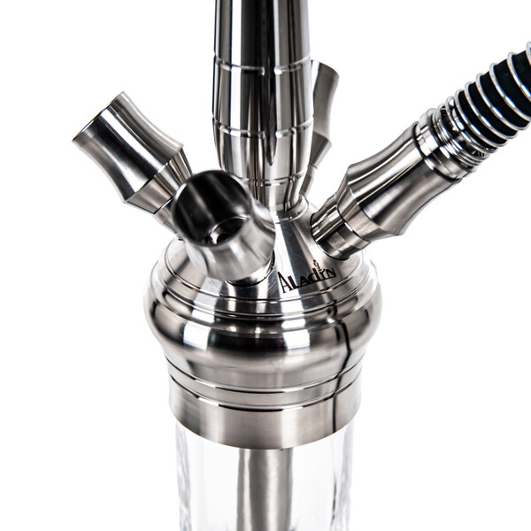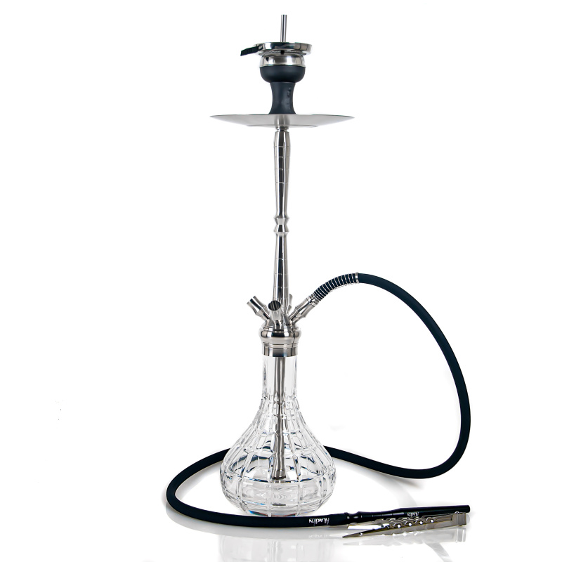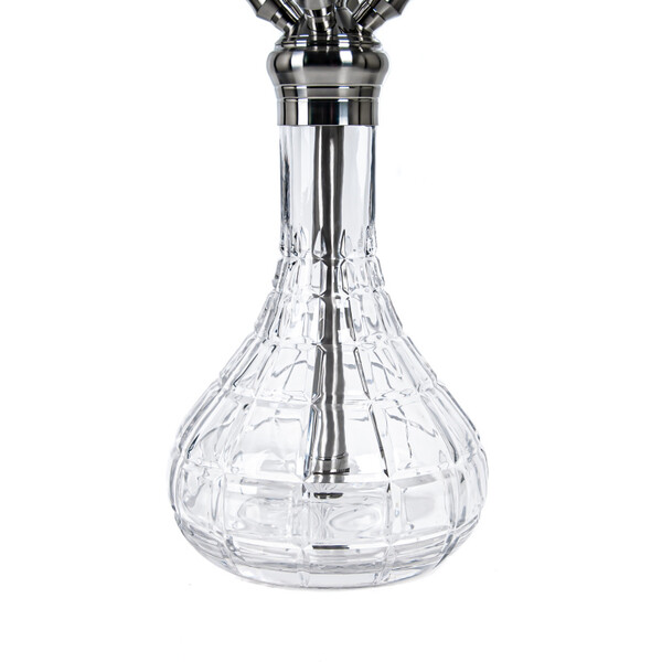The MVP 670 Cube four-hose hookah is milled from a hefty piece of stainless steel, which helps for better stability. The hookah won't topple over, even with careless handling. The decorated base gives the hookah a subtle touch of elegance and luxury. The downstem (bottom tube) is fitted with an adjustable diffuser, which softens the draw and reduces the gurgling. The hookah is complemented by a silicone soft touch hose with a soft velvety surface, which has a very pleasant feel. The black hose fits a black aluminium mouthpiece. And on top of the hookah is the ceramic Optimus bowl (without additional rings) with badcha.