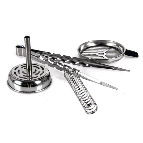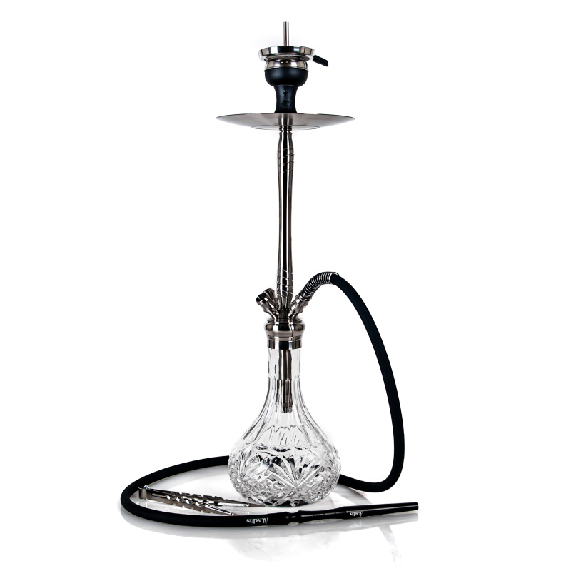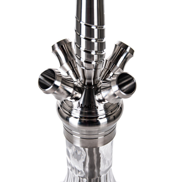 The MVP 670 Flower four-hose hookah is milled from a hefty piece of stainless steel, which helps for better stability. The hookah won't topple over, even with careless handling. The decorated base gives the hookah a subtle touch of elegance and luxury. The downstem (bottom tube) is fitted with an adjustable diffuser, which softens the draw and reduces the gurgling. The hookah is complemented by a silicone soft touch hose with a soft velvety surface, which has a very pleasant feel. The black hose fits a black aluminium mouthpiece. And on top of the hookah is the ceramic Optimus bowl (without additional rings) with badcha.