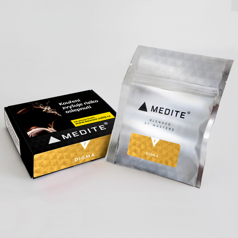 Triangles and letters of the Greek alphabet. The symbols decorating the boxes of the Czech Medite tablet, hiding a pouch with fifty grams of exquisite flavour.